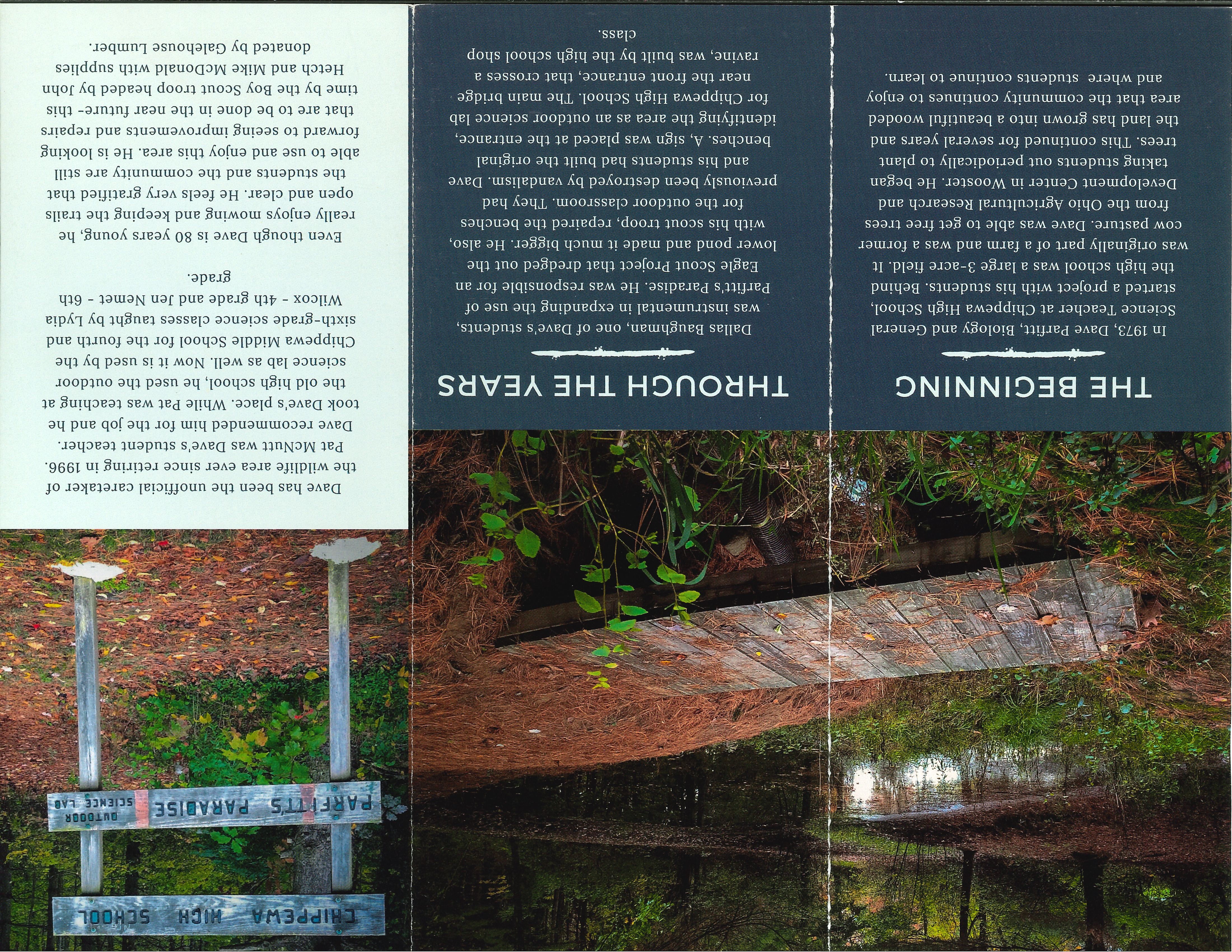 please click on this link below for the coverand this link for the inside pamphlet.“I am very gratified that students can still come down to it and learn about nature,” Parfitt said. “I come down here many times and run into former students and meet their kids. It is really a joy.” Although he is 81 years young, Parfitt still enjoys serving as the unofficial caretaker of the wildlife area of Parfitt’s Paradise. We are very thankful for his vision, passion for conservation, education and the legacy that he has left for future generations to enjoy! It truly is a paradise to visit...hidden behind the baseball diamond and a lucky gem for the Chippewa Local School students!